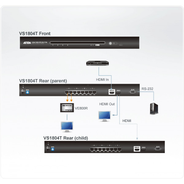• ATEN HDMI-splitter över Ethernet-kabel, 4 kanaler, 60m, 1080p, ljud VS1804T-AT-G ATEN HDMI-splitter över Ethernet-kabel, 4 kanaler, 60m, 1080p, ljud VS1804T-AT-G