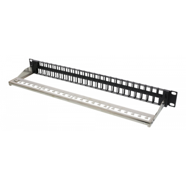 Med en öppen panel för keystone-moduler väljer du själv hur din konfiguration ska se ut. Panelen har utrymme för hela 48 moduler på endast 1 unit (1U) av utrymmer. En inbyggd kabelhantering håller kablarna på plats. Dessutom har den dubbla metallramar för att säkerställa att modulerna sitter ordentligt på plats. PAN-115
