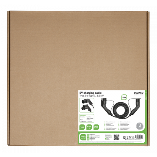 Deltaco e-Charge EV-11010 laddkabel passar alla fordon med en Typ1 uttag för den som vill ladda via en publik laddare eller den egna dedikerade laddboxen hemma med Typ2 uttag sk mode 3 laddning. Laddeffekt upp till 3. 6KW. Silverpläterade anslutningar borgar för god kontakt och lång livslängd. Längd 10M. Utrustad med dammskydd för att skydda mot damm, smuts och fukt vid förvaring. EV-11010