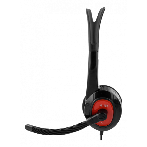 Stereo Headset, on-ear, c, 32 Ω , 1 x 3,5 mm 4-stift minitele-kontakt, 1,8 m kabel, svart/röd. Stereoheadset med högtalarelement som ger en klar ljudskärpa, har en flexibel mikrofonarm och en 1,8 m lång kabel. Headsetet ansluts till din dator eller telefon med en 3,5 mm minitele-kontakt. HL-108