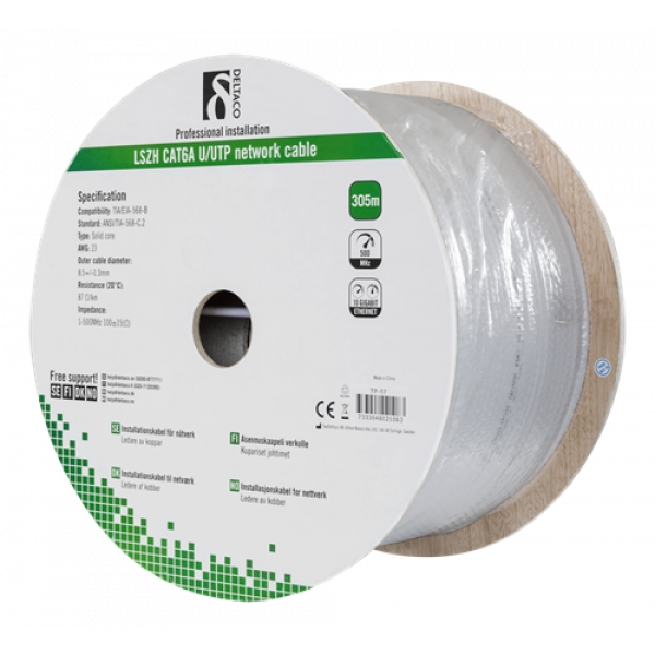 • DELTACO U/UTP Cat6a installationskabel, 305m trumma, 500MHz, LSZH, grå DELTACO U/UTP Cat6a installationskabel, 305m trumma, 500MHz, LSZH, grå