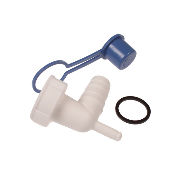 Connection for drain hose and condensation hose, 1 threaded connection (for water trap). Spout for drain hose: 18 mm. Spout for condensation hose: 8 mm. Gasket and aperture included. 2420012