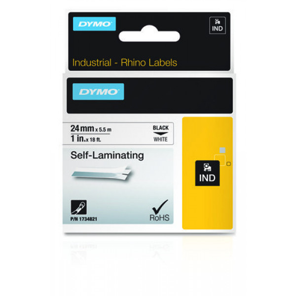 Rhino Professsional, self-laminating vinyl tape, 24mm, black text on white tape, 5.5m. 1734821